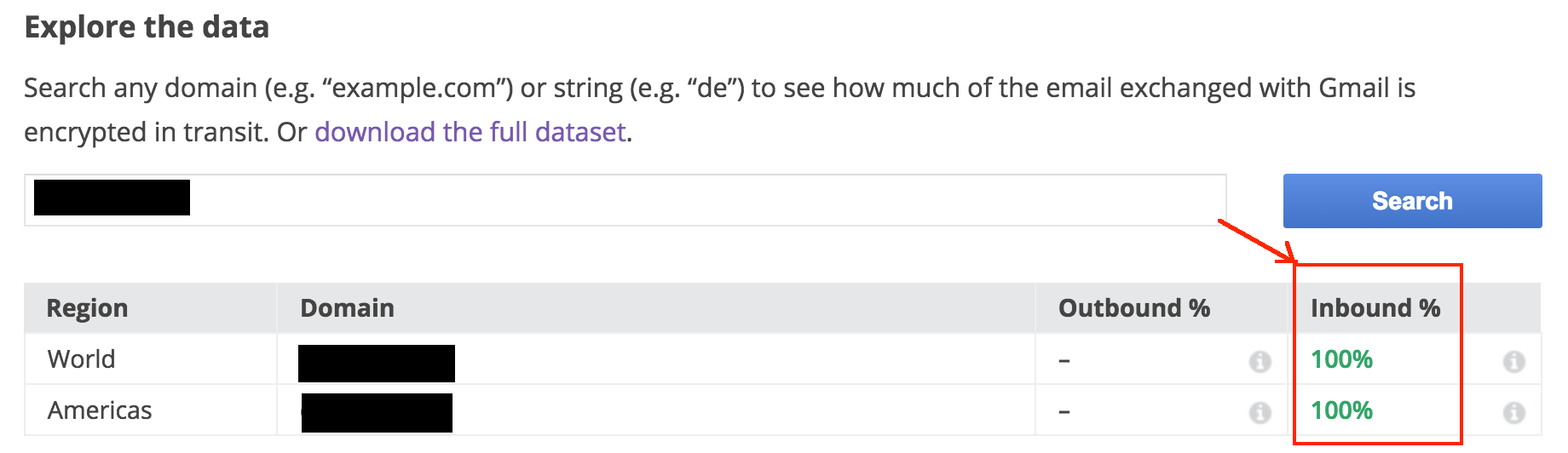 As an example, the screenshot below shows the results for a particular application. Google reports that 0 percent of the email entering Google from this application's mail servers is sent with TLS.